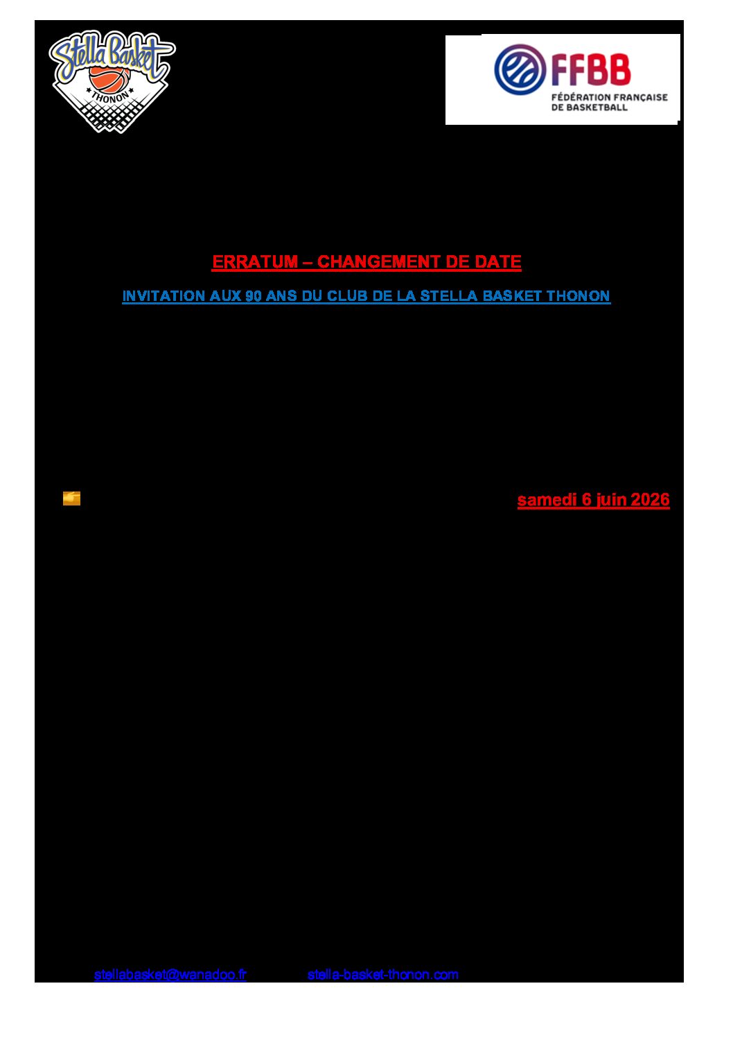 La fête des 90 ans de la STELLA THONON BASKET aura lieu le SAMEDI 6 JUIN, au gymnase du Genevray. Parlez en autour de vous, aux anciens joueurs, à ceux ou celles de votre équipe d’avant !!! etc….. Contact : eventstb74@gmail.com En espérant vous voir de nouveau à Thonon et au gymnase, Bien amicalement et […] Lire la suite...